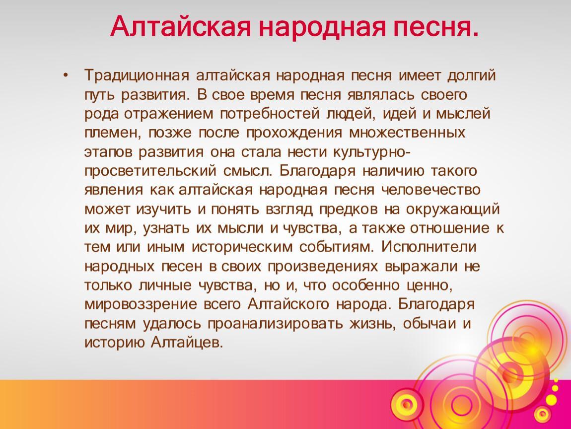 Песенная культура алтайского народа своими истоками уходит в глубокую древность. Она тесно связана с трудовой деятельностью, бытом, мировоззрением народа, его историей. Специфической особенностью песенного жанра алтайцев является то, что каждый род, каждое племя имели свои песни и соответственно свою своеобразную мелодическую окраску этих песен.