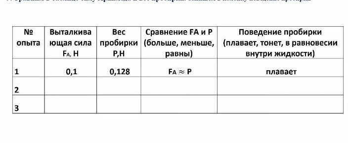 равны) равновесии внутри жидкости) 1 2 P,H 0,128 0,1 3 13. Сравни в таблице Силу Архимеда и вес пробирки. Запиши в колонку поведение пробирки No Выталкивающая сила FA, H опыта Вес пробирки P, H 0,128 Сравнение FA и P (больше, меньше, равны) FA SP Поведение пробирки (плавает, тонет, в равновесии внутри жидкости) Плавает 1 0,1 2 3 14 налогичные расчеты и выводы сделай самостоятельно для двух оставшихся опы е приведены на фото. Опыт No2 3 V=148 см mp=19,4г Опыт No 3 3 V=150 см m=33,7г 15. Полученные результаты занеси в таблицу. 16. Сделай вывод и запиши в конце лабораторной работы.
