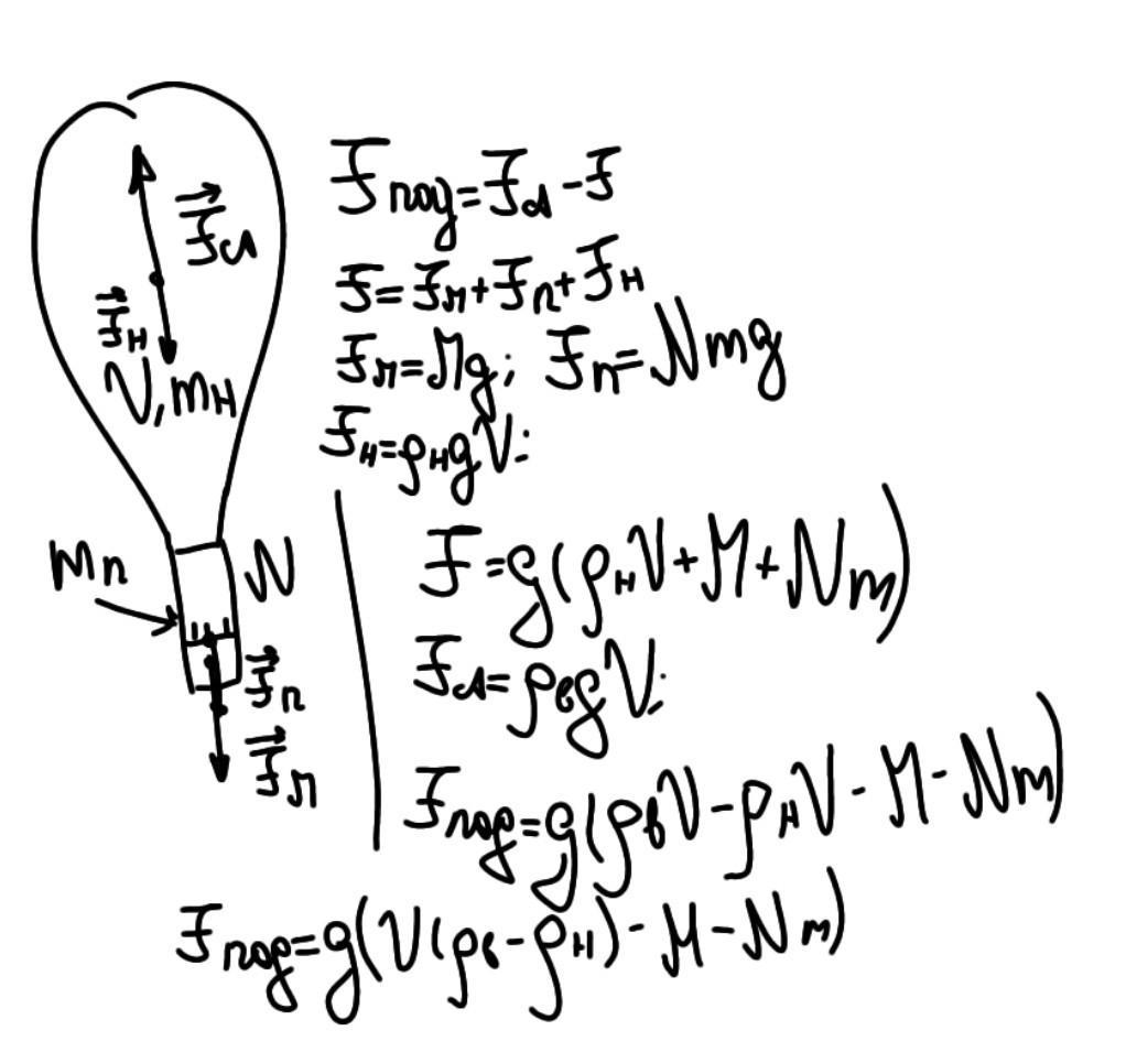 Чтобы узнать, сможет ли шар поднять себя и пассажиров нужно найти подъемную силу. Она равна разности силы архимеда и силы тяжести самого шара, пассажиров и веса водорода.