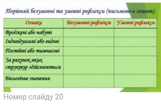 Умовні рефлекси: Набуті, Індивідуальні, Тимчасові, Здійснюються за допомогою кори головного мозку, Біологічне значення полягає в тому, що вони є пристосувальними реакціями організм, які формуються умовами життя людини і дають можливість заздалегіть пристосуватись до нових умов.