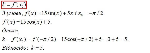 Обчисли кутовий коефіцієнт дотичної до графіку функції f(x) = 15 sin x + 5х у точці з абсцисою х0=-п/2
