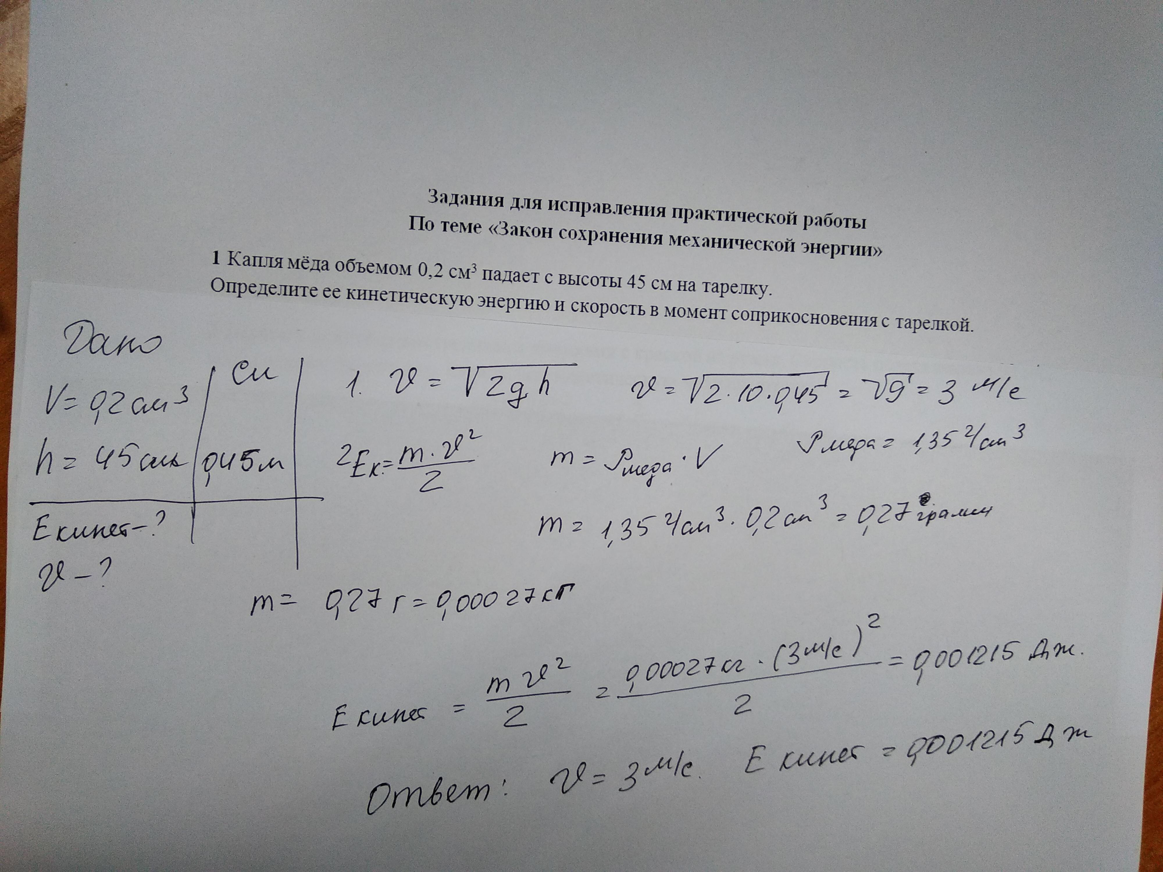 капля мёда объёмом 0,2 см2 падает с высоты 45 см на тарелку. Определите её кинетическую энергию и скорость в момент соприкосновения с тарелкой