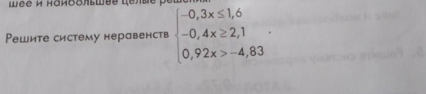 \left\{\begin{array}{ccc}-0,3x\leq 1,6\\-0,4x\geq 2,1\\0,92x > -4,83\end{array}\right\\\\\\\left\{\begin{array}{ccc}x\geq -5\dfrac{1}{3} \\x\leq -5,25\\x > -5,25\end{array}\right\\\\\\Otvet: \ x\in \ \oslash