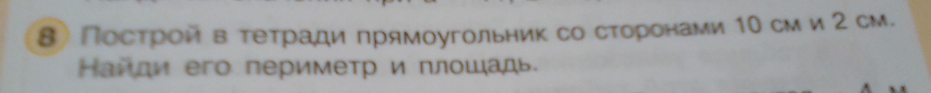 8.Построй в тетради прямоугольник со сторонами 10 см и 2 см.Найди его периметр и площадь