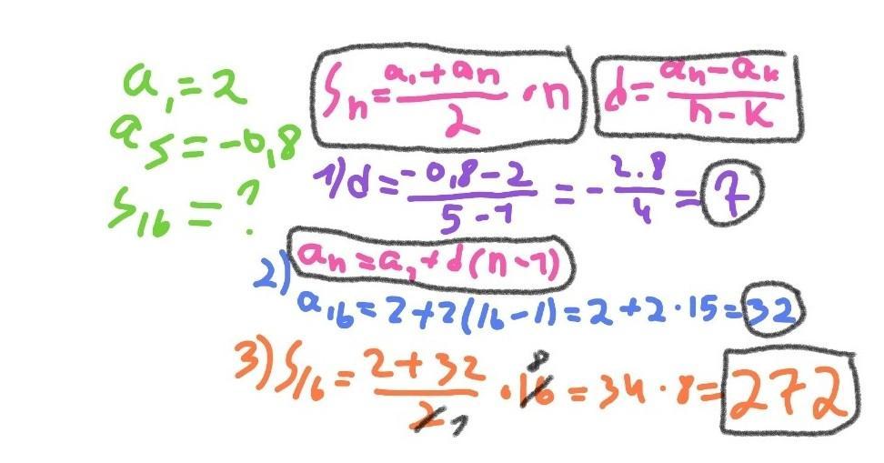 Знайти суму шістнадцяти перших членів арифметичної прогресії якщо перший член дорівнює 2,а п'ятий -0,8