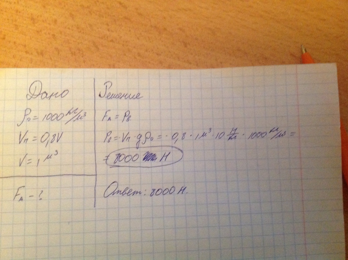 чему равна сила архимеда, действующая на шар, плавающий поверхности воды, объемом 1м^3? шар погружен в воду на 80% своего объема, плотность воды 1000 кг/м^3