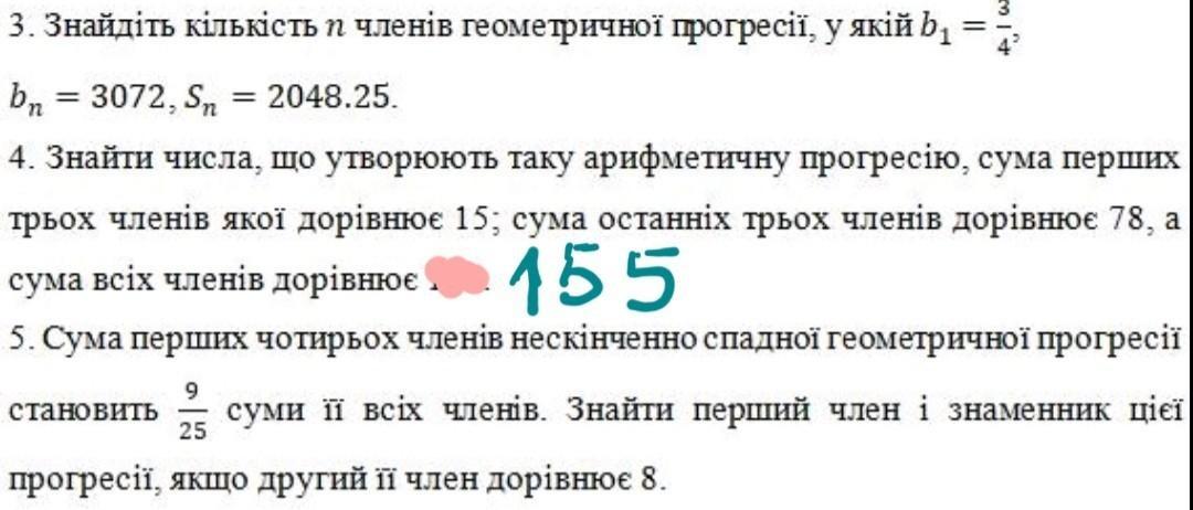 4. Знайти числа, що утворюють таку арифметичну прогресію, сума перших трьох членів якої дорівнює 15 ; сума останніх трьох дорівнює 78 , а сума всіх членів дорівнює 155.(помилка на картинці якщо що то виправив на картинці. )