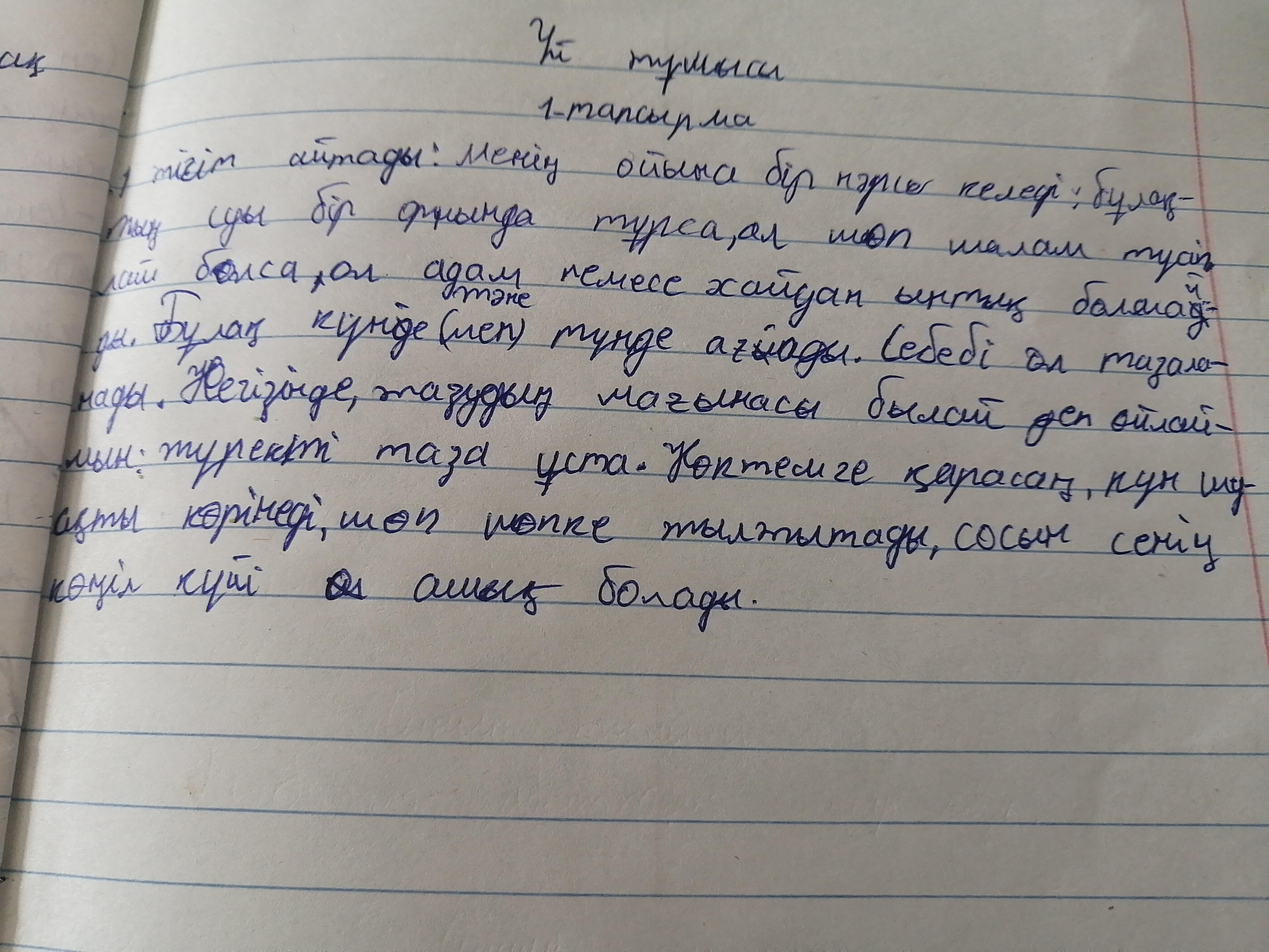 1-тапсырма Көрнекті ағартушы Ыбырай Алтынсариннің «Таза бұлақ» еңбегінен алынған үзіндіні оқып, өз түсініктеріңді жазыңдар. т...Менің ойыма бір нәрсе келеді: бұл бұлақтың суы бір орында тұнып тұрып, шөп шалам түсіп, лай-қоқым болса, дам мен хайуан мұнша ынтық болмас еді; бұлақ күні-түні 2