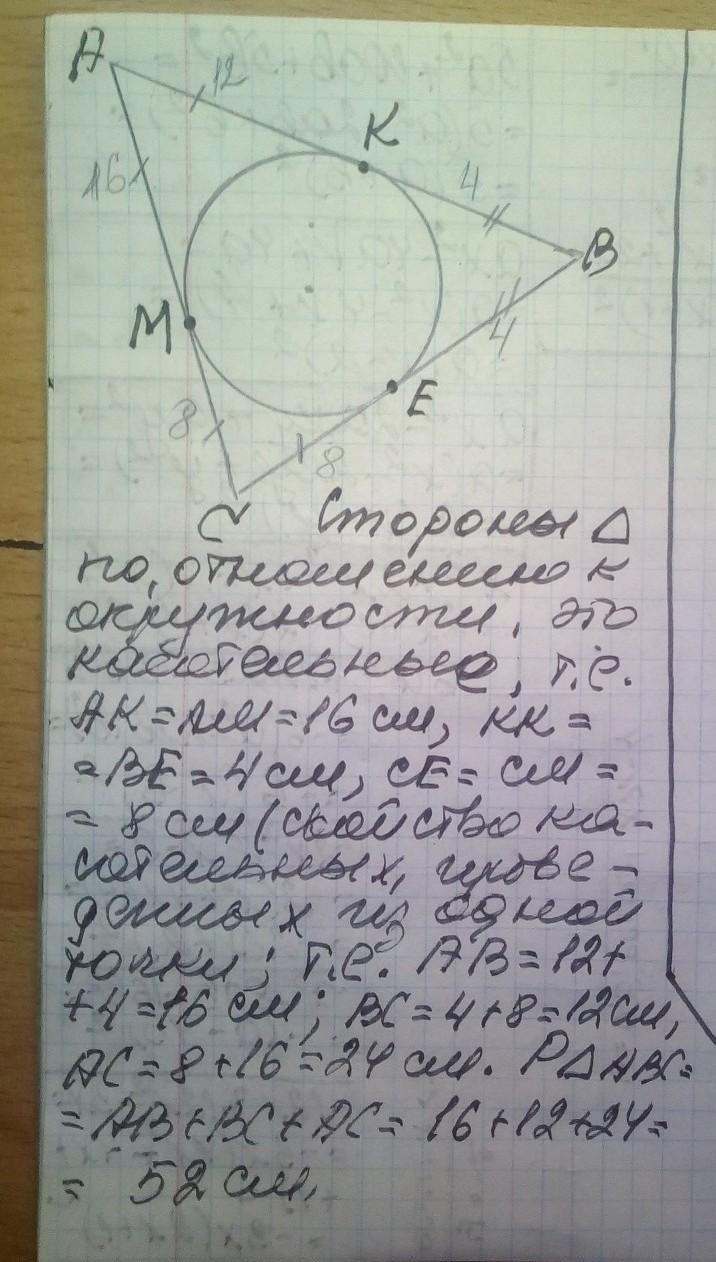 До сторін АВ, ВС, АС відповідно ВК = 4см, КС = 8см та МА = 16см