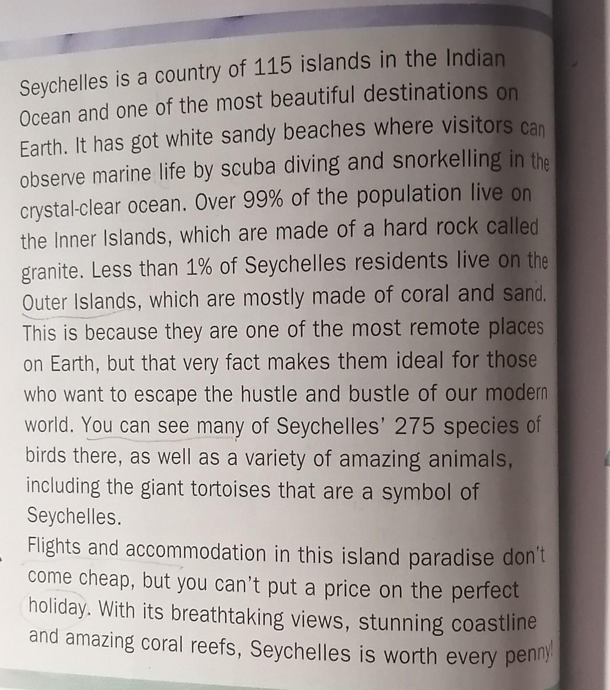 1)visitors can observe marine life by scuba diving and snorkelling in the crystal-clear ocean.2) is because they are one of the most remote places on Earth3) You can see many of Seychelles' 275 species of birds there, as well as a variety of amazing animals, including the giant tortoises that are a symbol of Seychelles.4) Flights and accommodation in this island paradise don't come cheap, but you can't put a price on the perfect holiday.