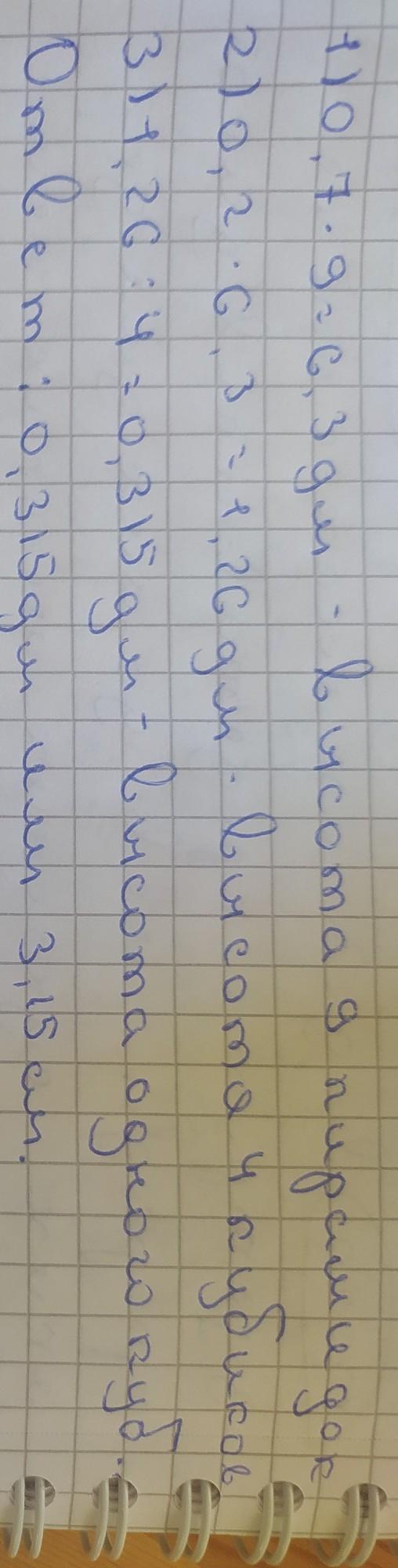 Высота 4 кубиков составляет 20% высоты 9 колец пирамидки. Какова высота одного кубика, если высота одного кольца пирамидки 0,7 дм?