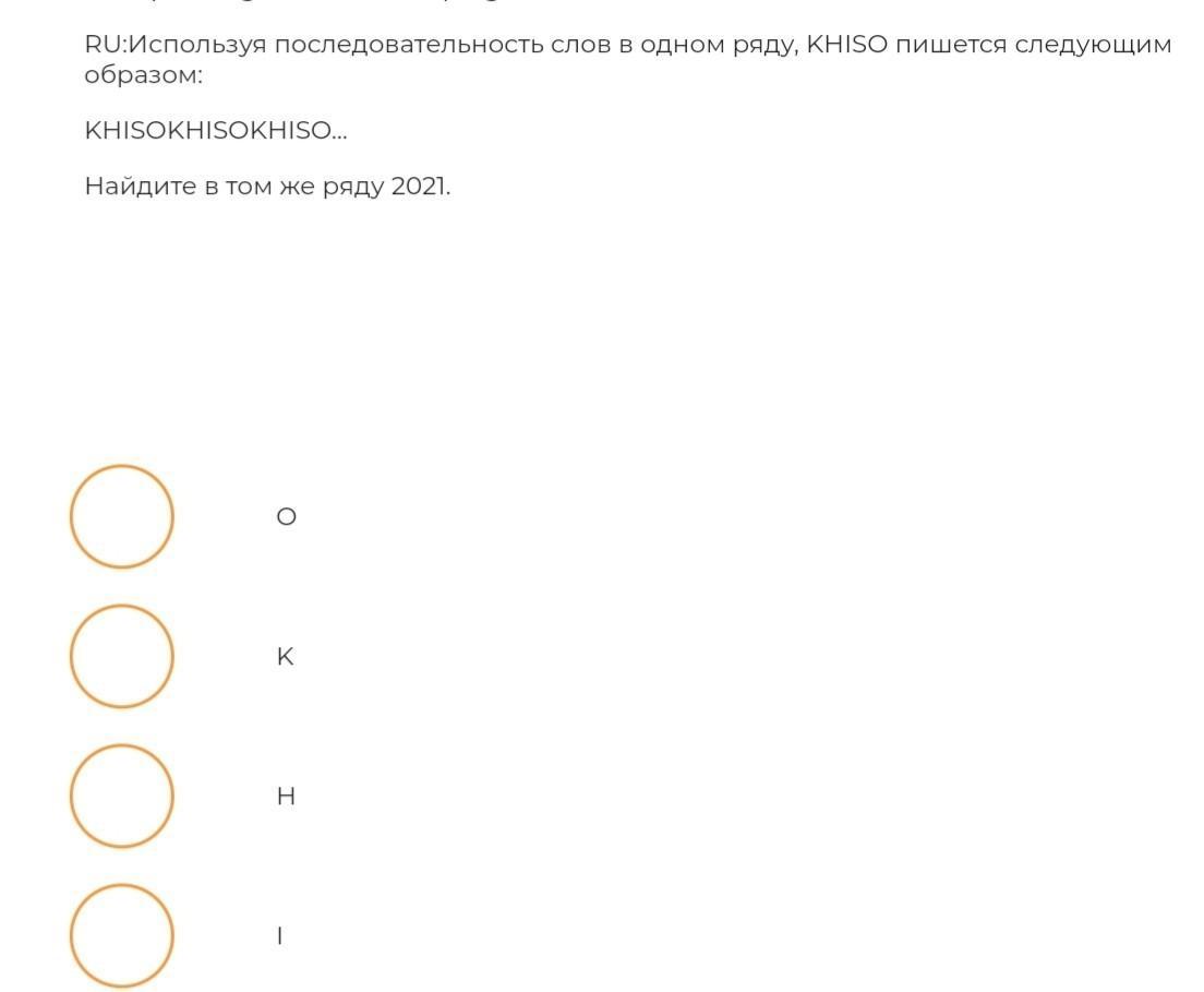 КHISO - 5 букв. 2021:5=404 (ост.1) - 404 раза полностью написано слово КHISO и в конце первая буква этого слова. Ответ: К.