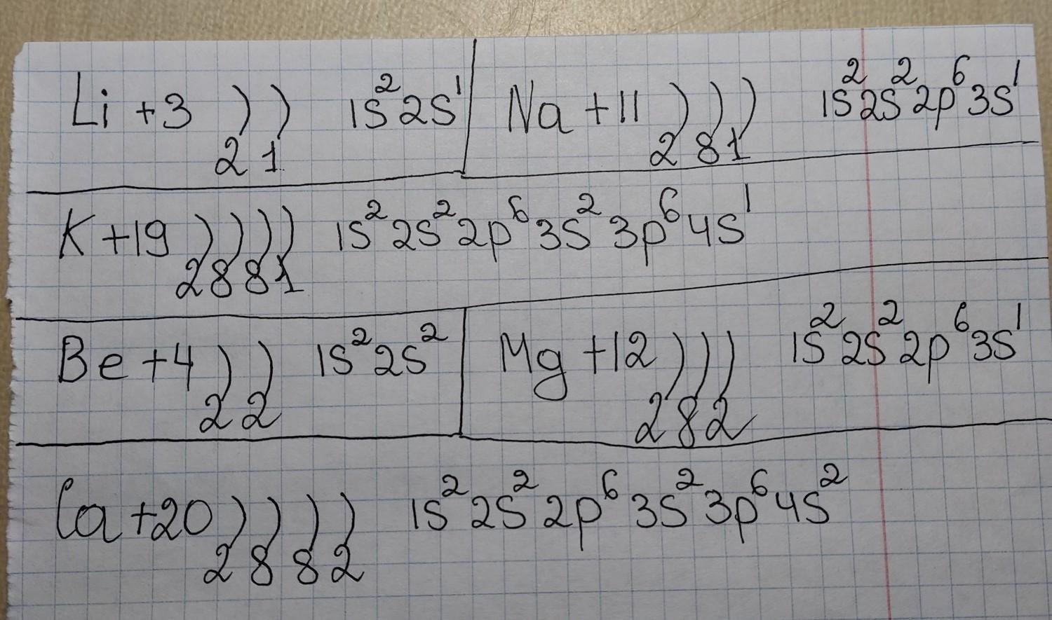 Изобразите строение атомов с распределением электронов по энергетическим уровням: Li, Na, K, Be, Mg, Ca. какие из этих металлов находятся в одном периоде? Что общего в строении их атомов?