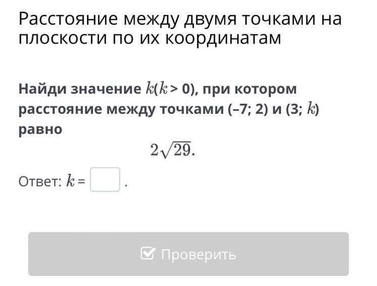 Найди значение k(k > 0), при котором расстояние между точками (–7; 2) и (3; k) равно