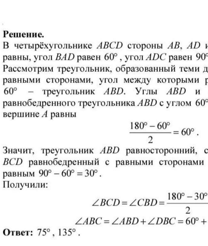 Три стороны выпуклого четырёхугольника равны, а два его угла, образованные этими сторонами, равны 60° и 90°. Найдите больший угол этого четырёхугольника. Ответ дайте в градусах.