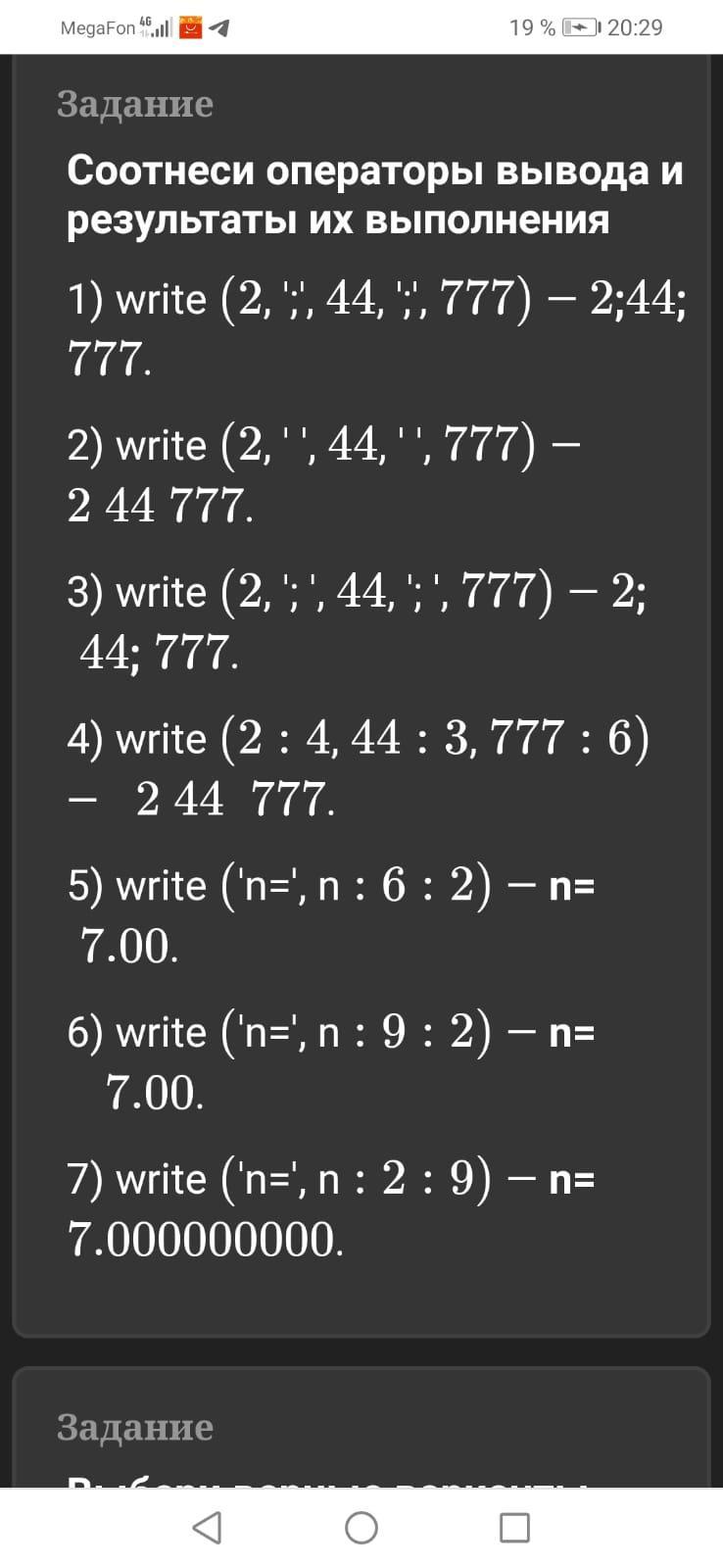 Соотноси операторы вывода и результаты их выполнения 244 777 2; 44; 777 n= 7.00 n= 7.00 2:44:777 n=7.000000000 2 44 777