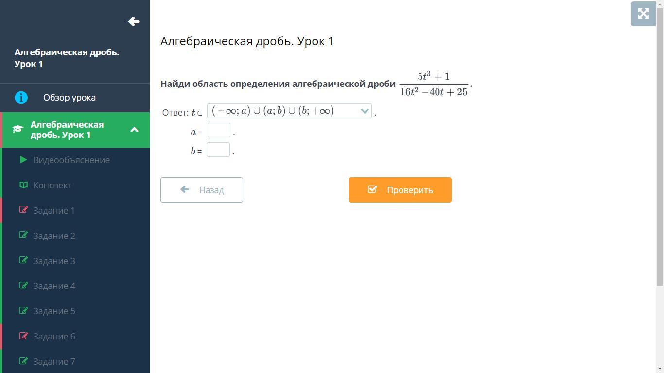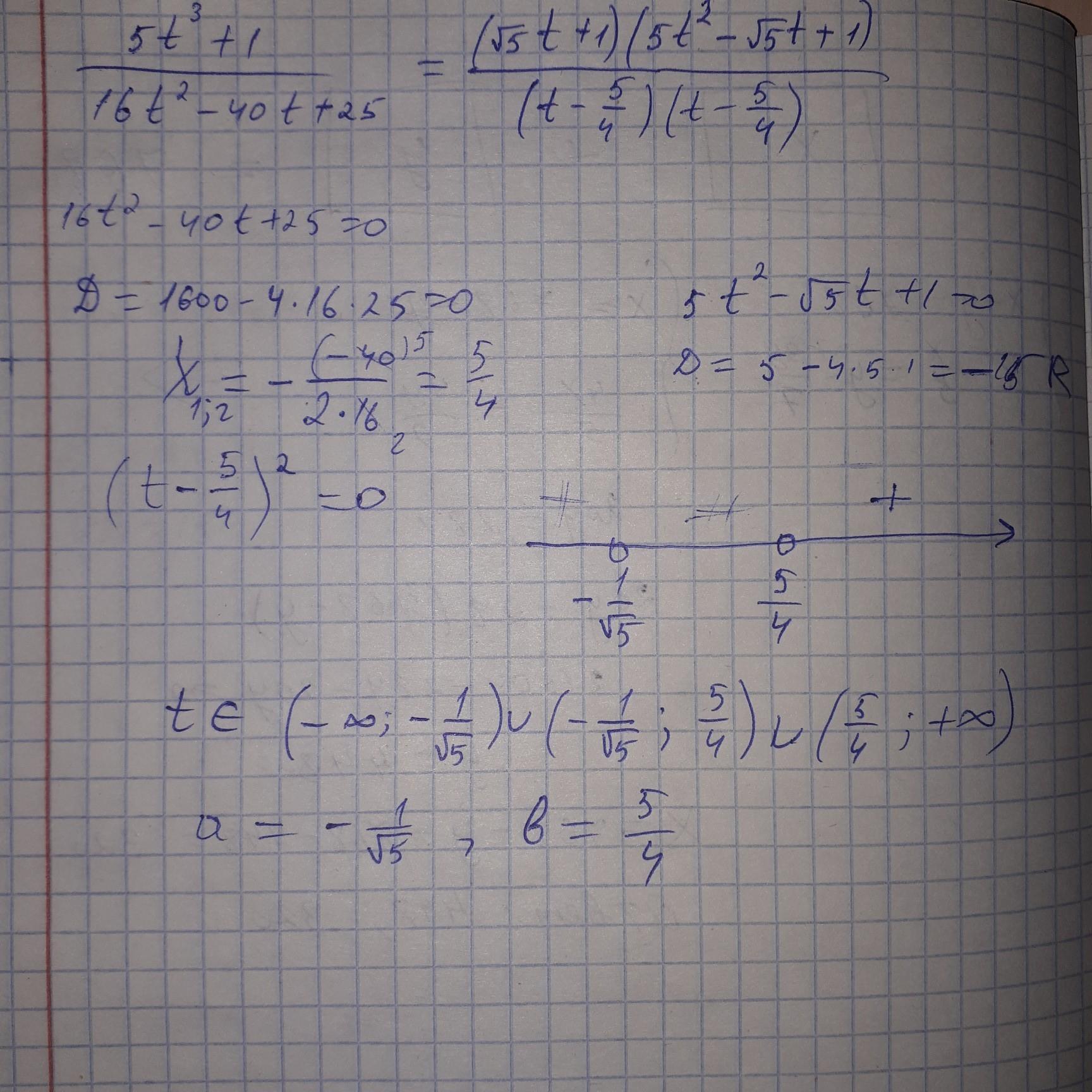 Найди область определения алгебраической дроби 5t^3+1/16t^2-40t+25