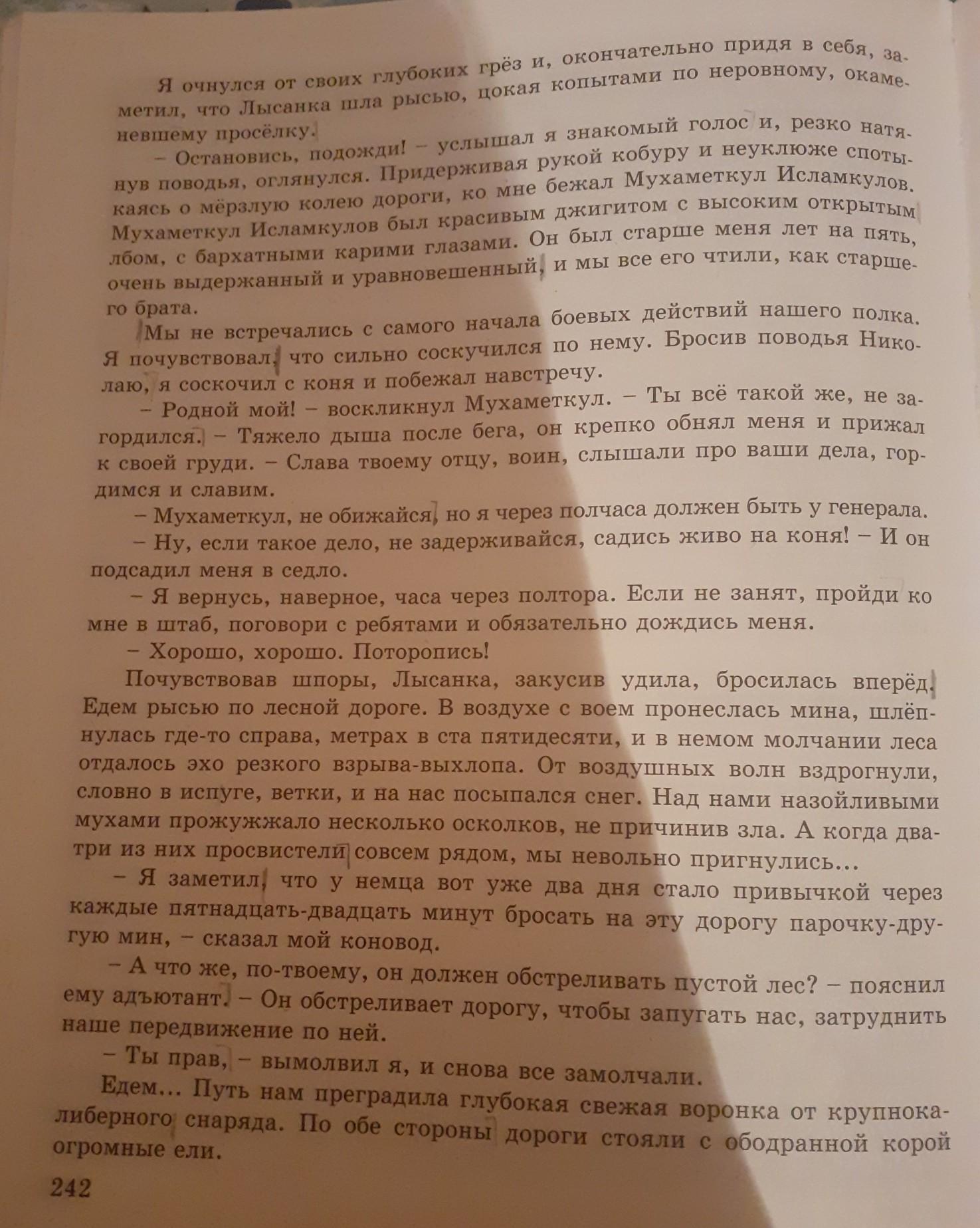 Ответ:Главный герой просыпаеться и слышит знакомый голос.Это оказываеться его давний товарищ,они не видились с начала военных действий.Мухаметкул был рад видеть своего знакомого.Они пожали себе руки и увидели как их лошадь куда то опять побежала.Главный герой заметил что немец каждые 15-20 минут кидает мины на дорогу.И товарищ сказал "А ты думаешь он будет в пустой лес стрелять".Герой согласился с знакомым.Он видел как дорога была разорвана