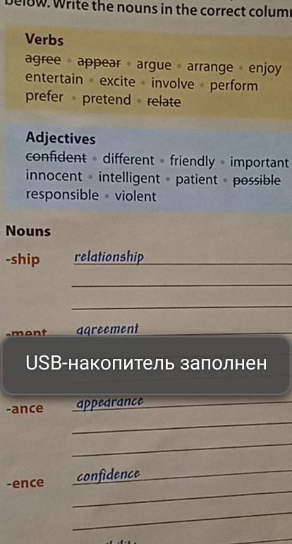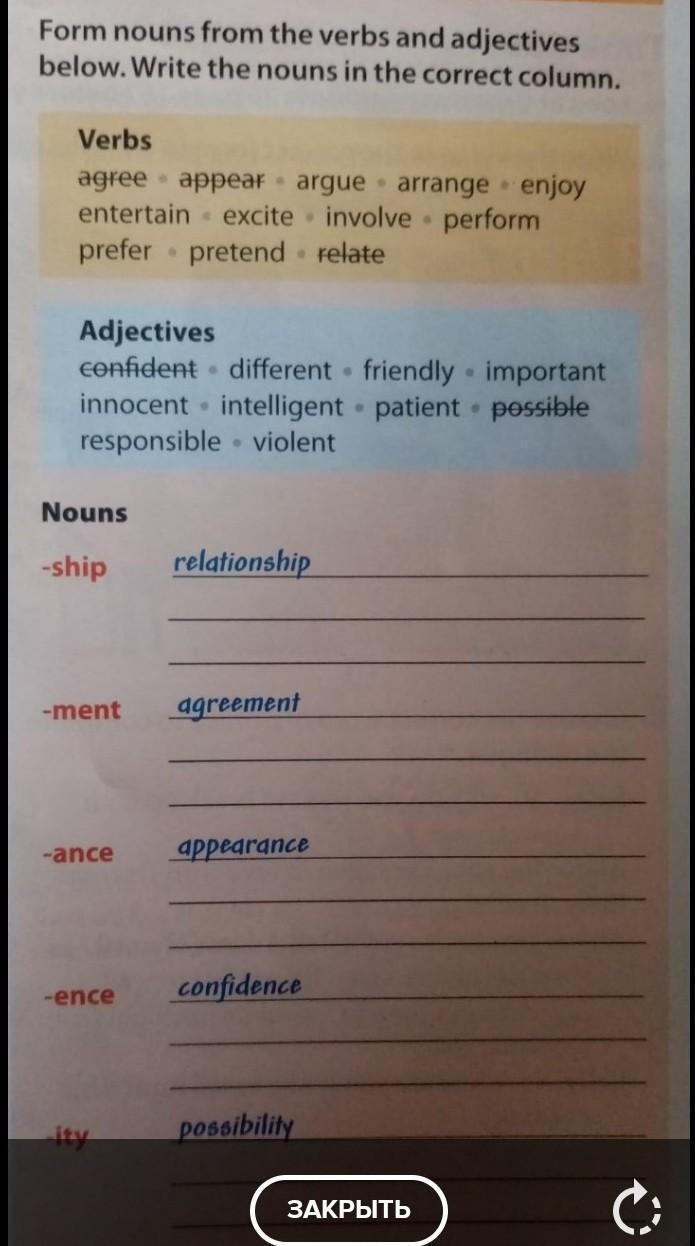 VOCABULARY Form nouns from the verbs and adjectives below. Write the nouns in the correct column.