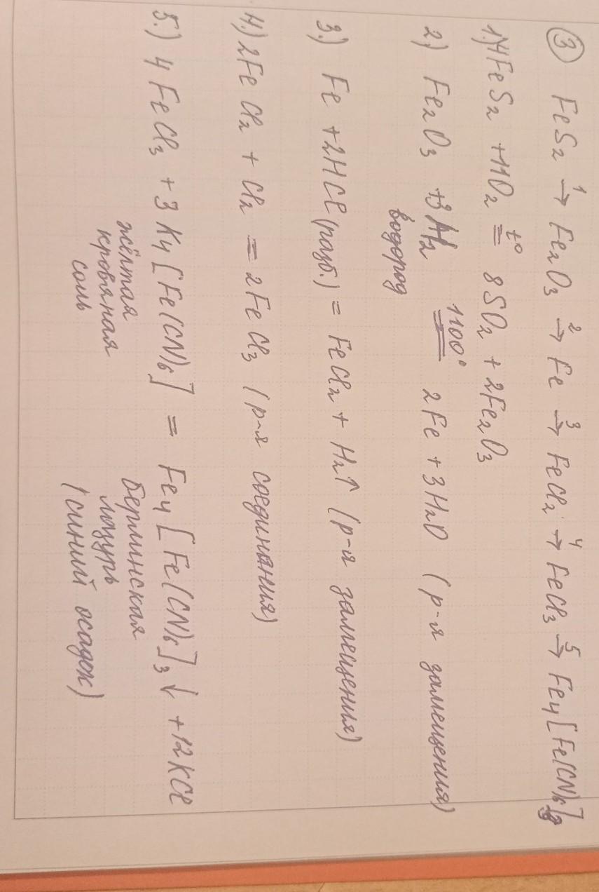 3) Fes2–Fe2O3–Fe–FeCl2–FeCl3–Fe4[Fe(Cn)6)6