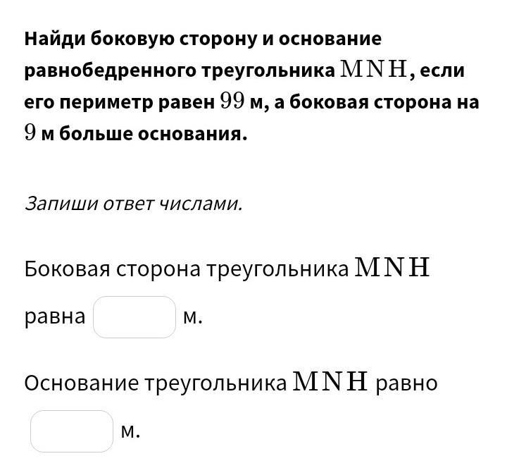 Найди боковую сторону и основание равнобедренного треугольника MNH, если его периметр равен 99 м, а боковая сторона на 9м больше основания.