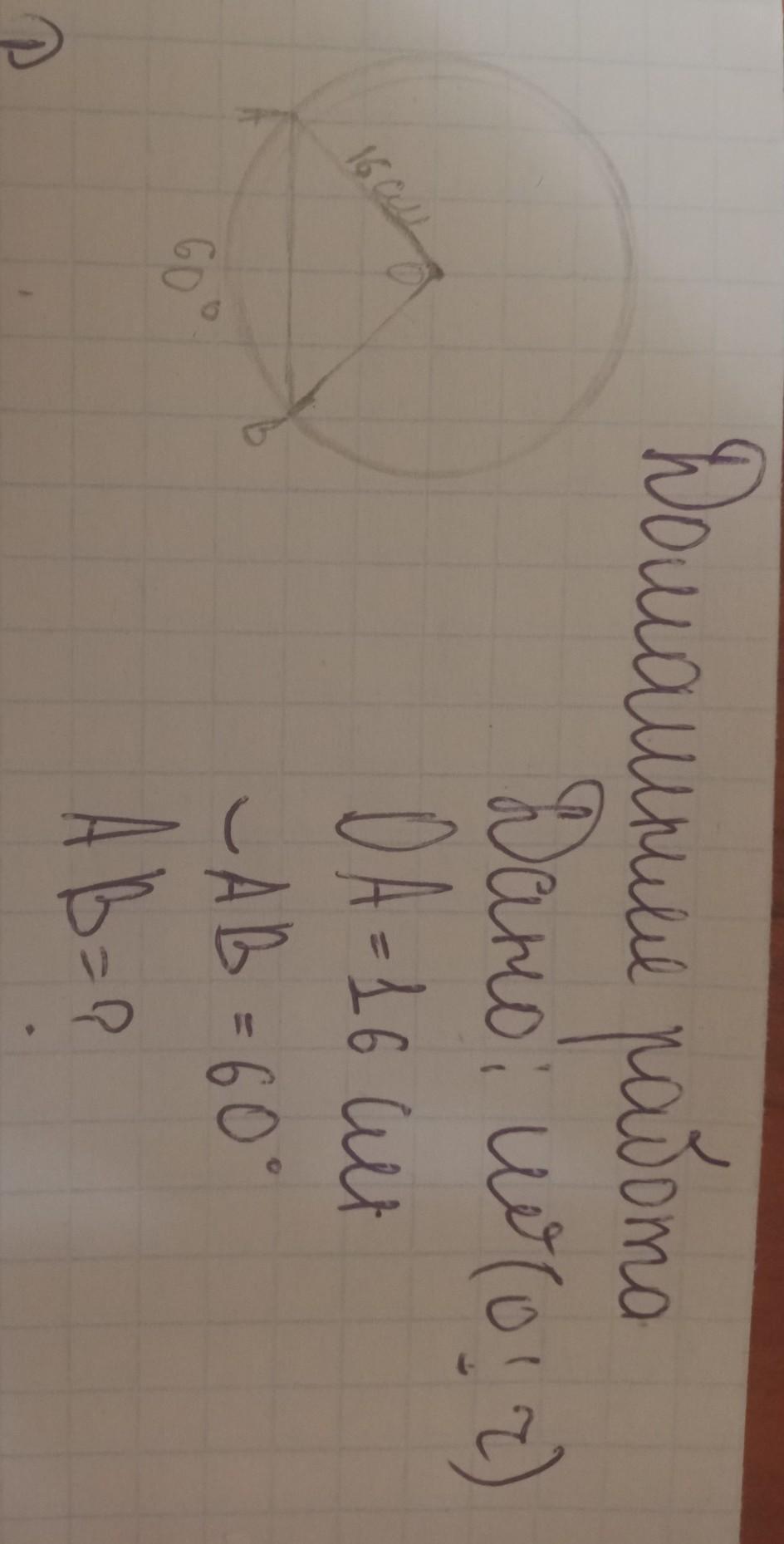 Т.к. дуга AB = 60°, то и угол AOB будет равен 60°. И по теореме косинусов находим AB.(AO=OB)