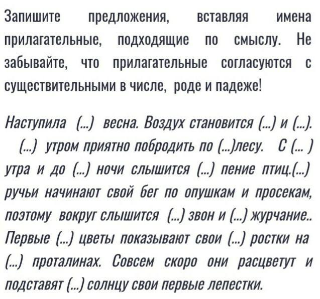 Ответ:1. Долгожданная 2. ччистым и прозрачным 3. Ранним , большому 4. С раннего , до поздней ночи .... звонкое5. Быстрые, сильный звон и приятное журчание.6. весенние, первые ростки , узких проталинах 7.прекрасные