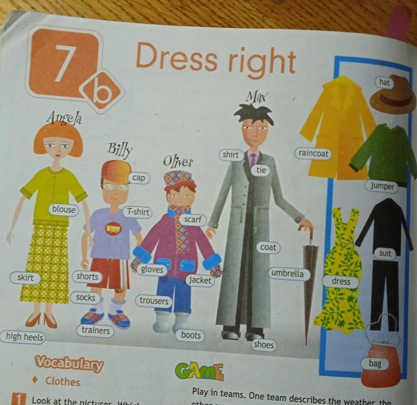 описать одежду Angela, Billy, Oliver, Max Например: Max wears grey long coat, purple shirt , violet tie and black shoes. Указывать цвет , возможно размер (длинный / короткий)