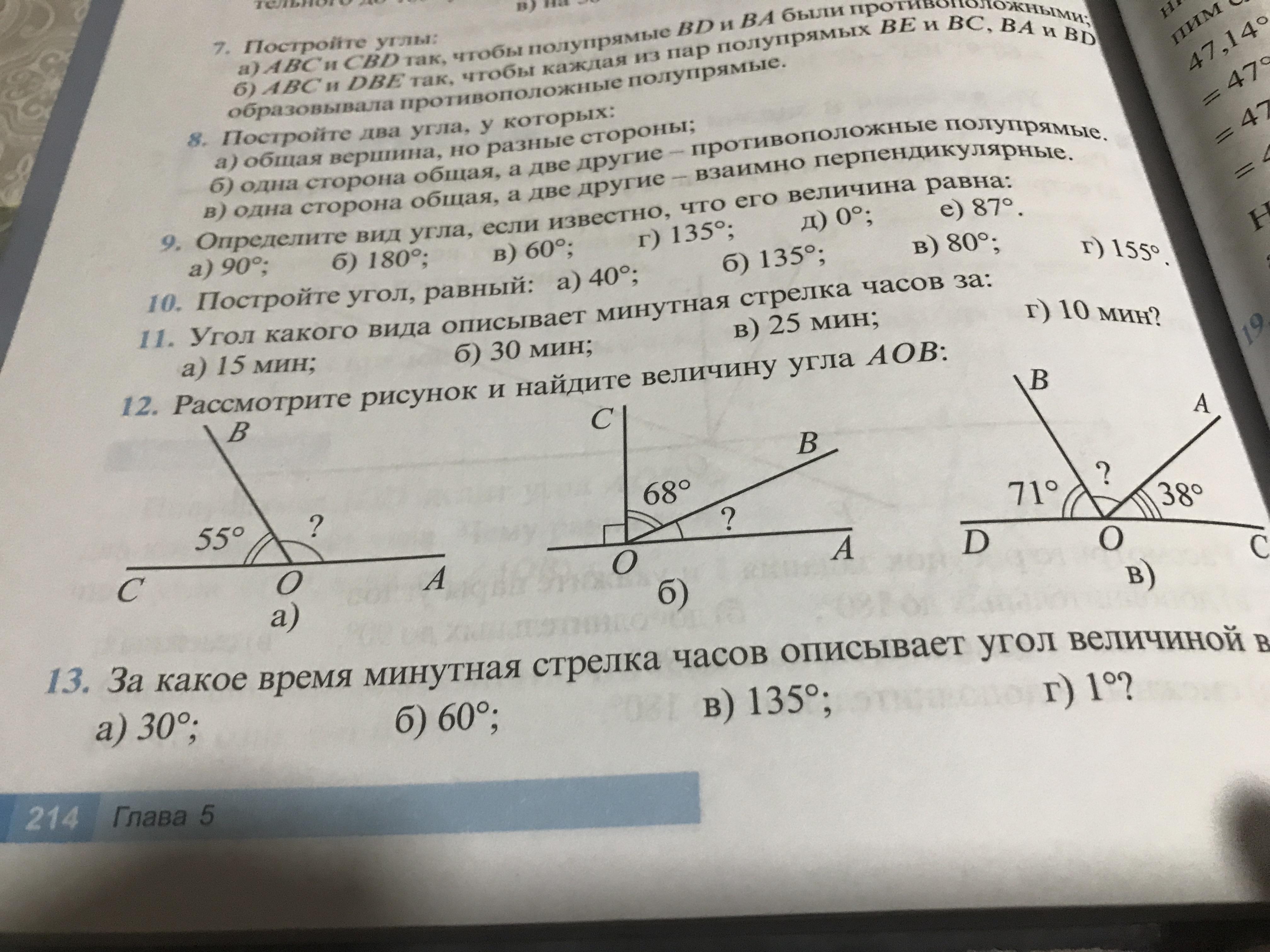 Пошаговое объяснение: а) 180°-55°=125° (смежные углы) б) 180°-90°-68°=22° (межные углы, 90° - это прямой угол) в) 180°-71°-38°=71° (смежные углы)