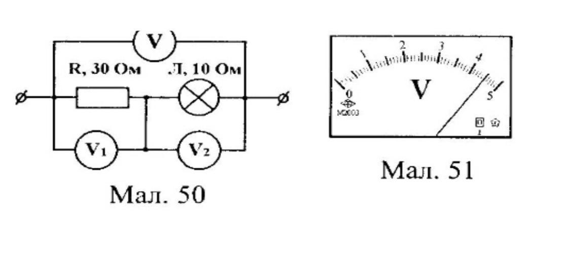Показы вольтметра V2 в круге, схема которого на рисунке 50, отображены на шкале(рис.51). Какие показы вольтметров V i V1