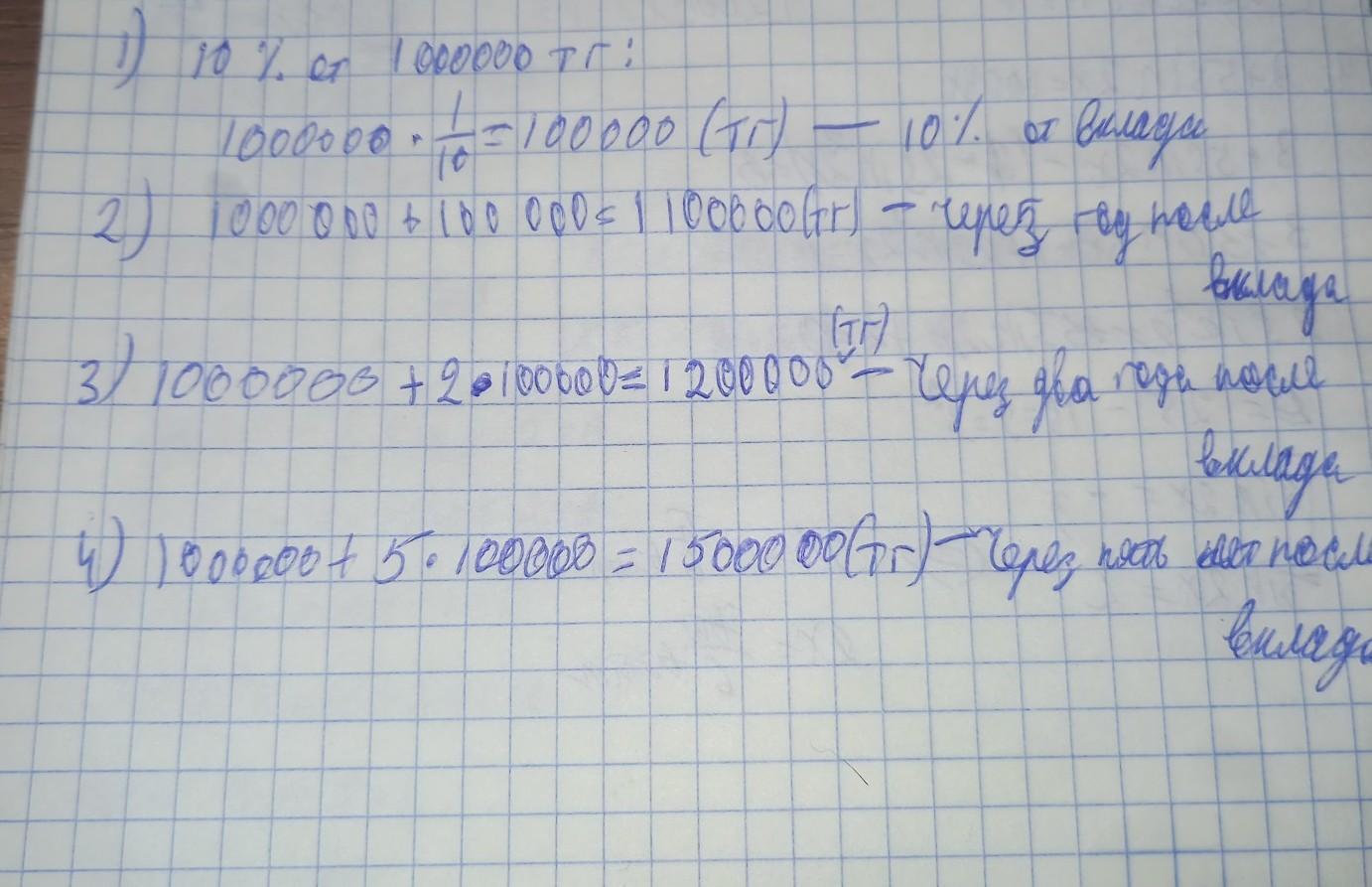 На банковский вклад положили 1 млн тг. Сколько будет на вкладе через год, два года, через пять лет, если банк начисляет 10% в год