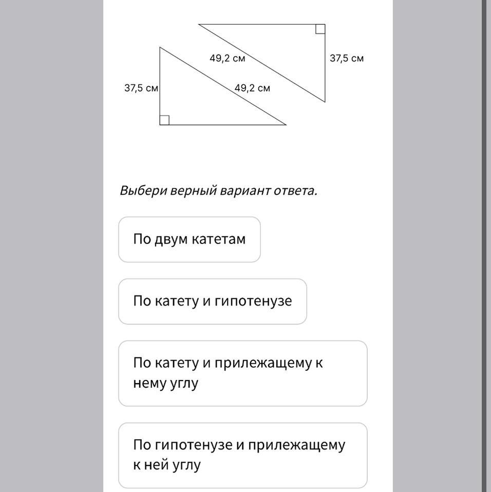 прямоугольные треугольники равны по катету и гипотенузе