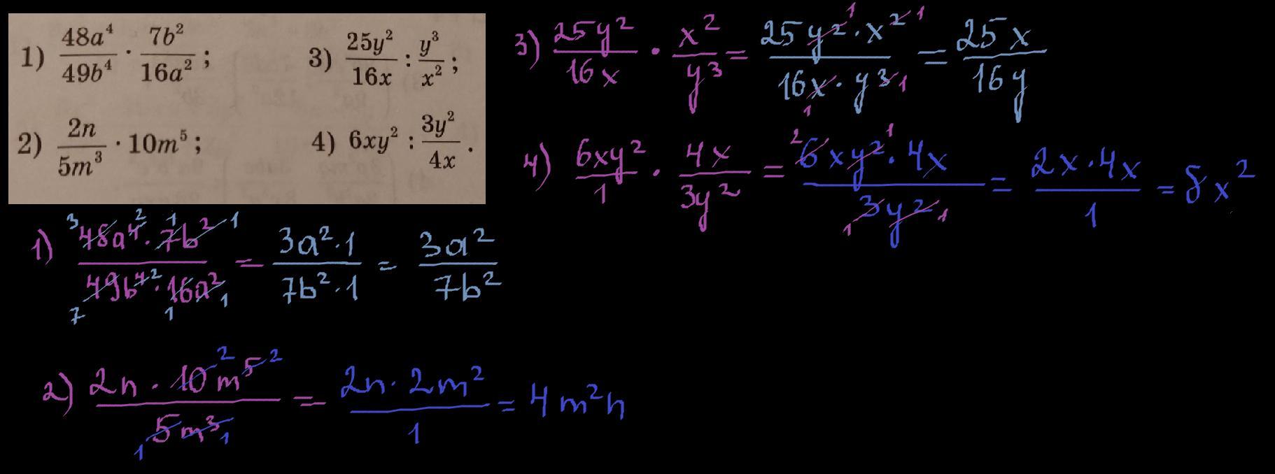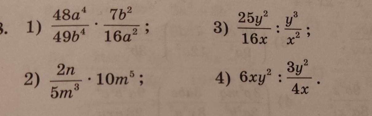 6.68. 1) 48a 762 4964 16a 2 : 3) 25y?. y 16x : x2 2 ; х 2n 2 2) · 10m; . 2. 3y? 4) 6xy? : 5m3 4x