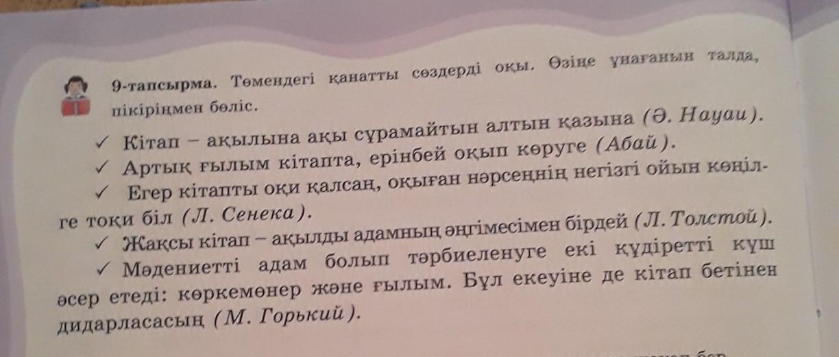 9-тапсырма. Төмендегі қанатты сөздерді оқы. Өзіңе ұнағанын талда, пікіріңмен бөліс.