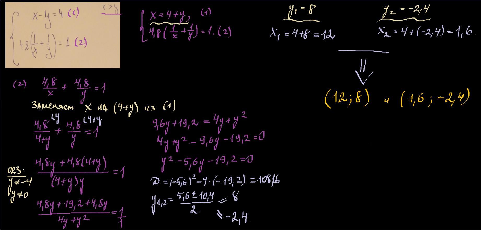 Дорешать систему. Ответ должен быть 12 и 8. Без Photomath. Спасибо (. ❛ ᴗ ❛.) До 23:00 мск, макс. до завтра 6:00мск