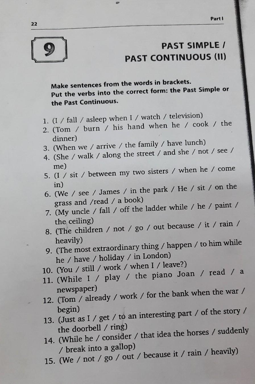 11. While I was playing the piano Joan was reading a newspaper. 12.Tom was working for the bank when the war began. 13.Just as I got to an interesting part of the story the bell rang. 14.While he was considering that idea the horses suddenly broke into a gallop.