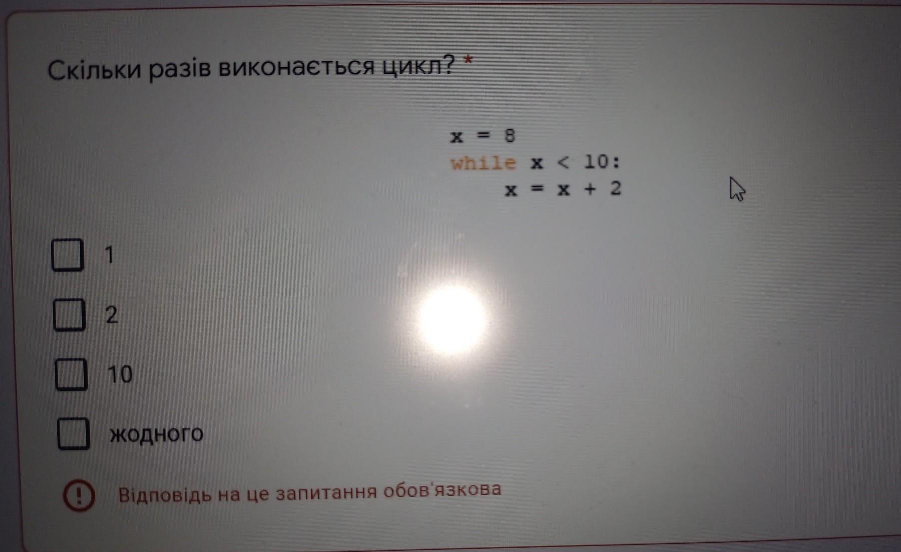 Скільки разів виконається цикл? ? х = В рех с 10: x = x + 2 1 2 Це 10 жодного Відповідь на це запитання обов'язкова