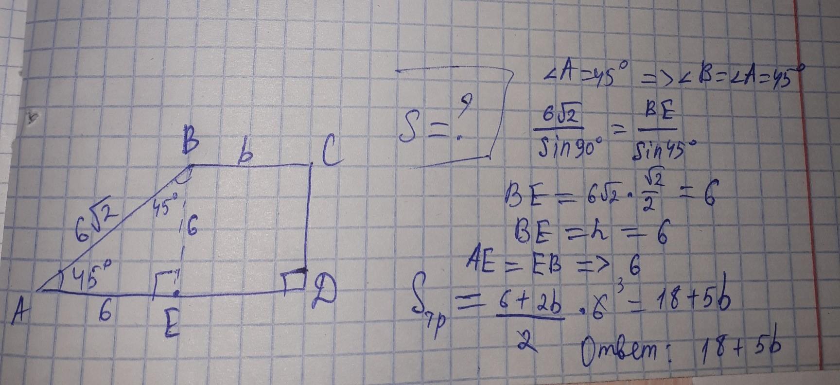 меньшее основание прямоугольной трапеции равно b, а большая боковая сторона 6 корень из 2, а угол при большем основании 45°. Найти площадь трапеции.