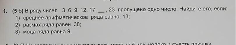 1. (5 б) В ряду чисел 3, 6, 9, 12, 17. ___ , 23 пропущено одно число. Найдите его, если: 1) среднее арифметическое ряда равно 13; 2) размах ряда равен 38; 3) мода ряда равна 9.
