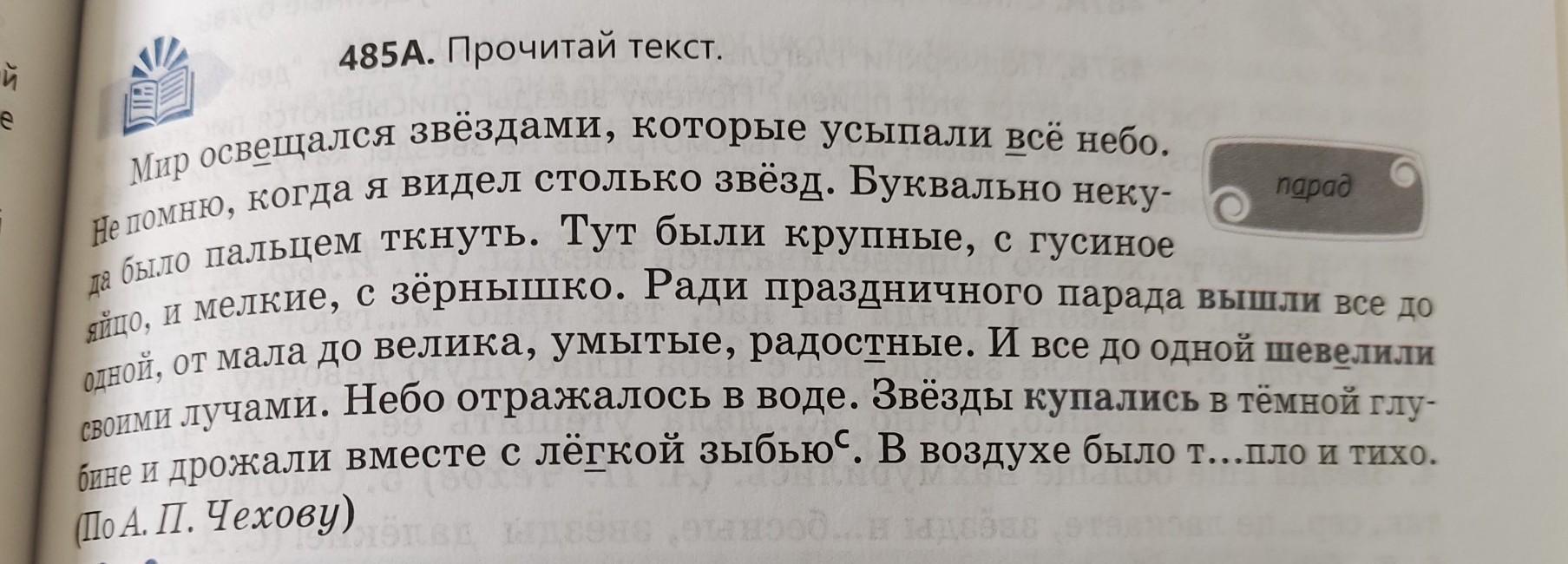Мир освещался звёздами, которые усыпали всё небо. Не помню, когда я видел столько звёзд. Буквально неку- было пальцем ткнуть. Тут были крупные, с гусиное Да но, и мелкие, с зёрнышко. Ради праздничного парада вышли все до своими лучами. Небо отражалось в воде. Звёзды купались в тёмной глу- бине и дрожали вместе с лёгкой зыбью". В воздухе было т...пло и тихо. По А. П. Чехову) одной, от мала до велика, умытые, радостные. И все до одной шевелили