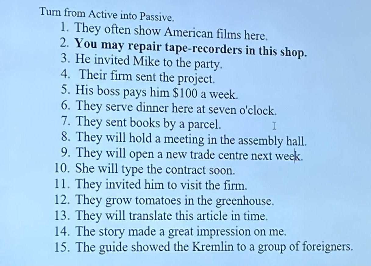 Я так понимаю, надо переделать то, что на картинке, в пассив и записать только подлежащее и сказуемое.