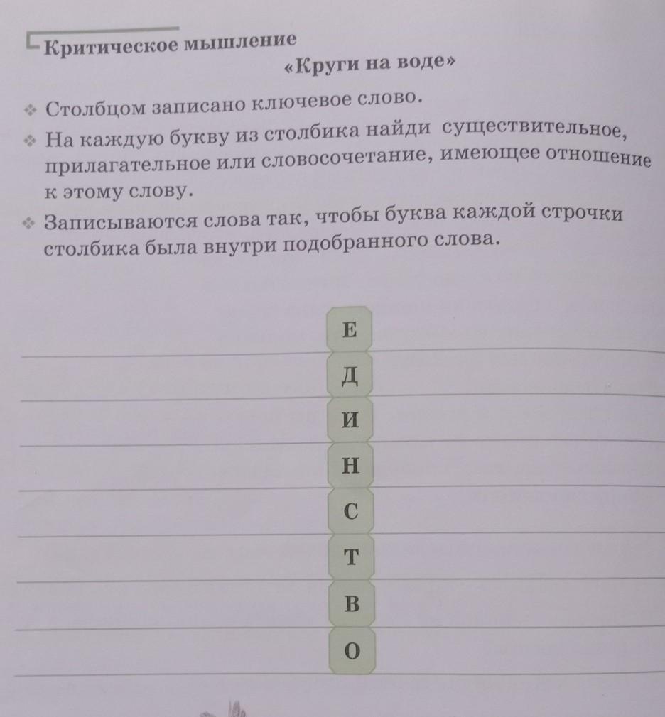 Критическое мышление «Крути на воде» Столбцом записано ключевое слово. • На каждую букву из столбика найди существительное, прилагательное или словосочетание, имеющее отношение к этому слову. Записываются слова так, чтобы буква каждой строчки столбика была внутри подобранного слова. Единство помогитеее