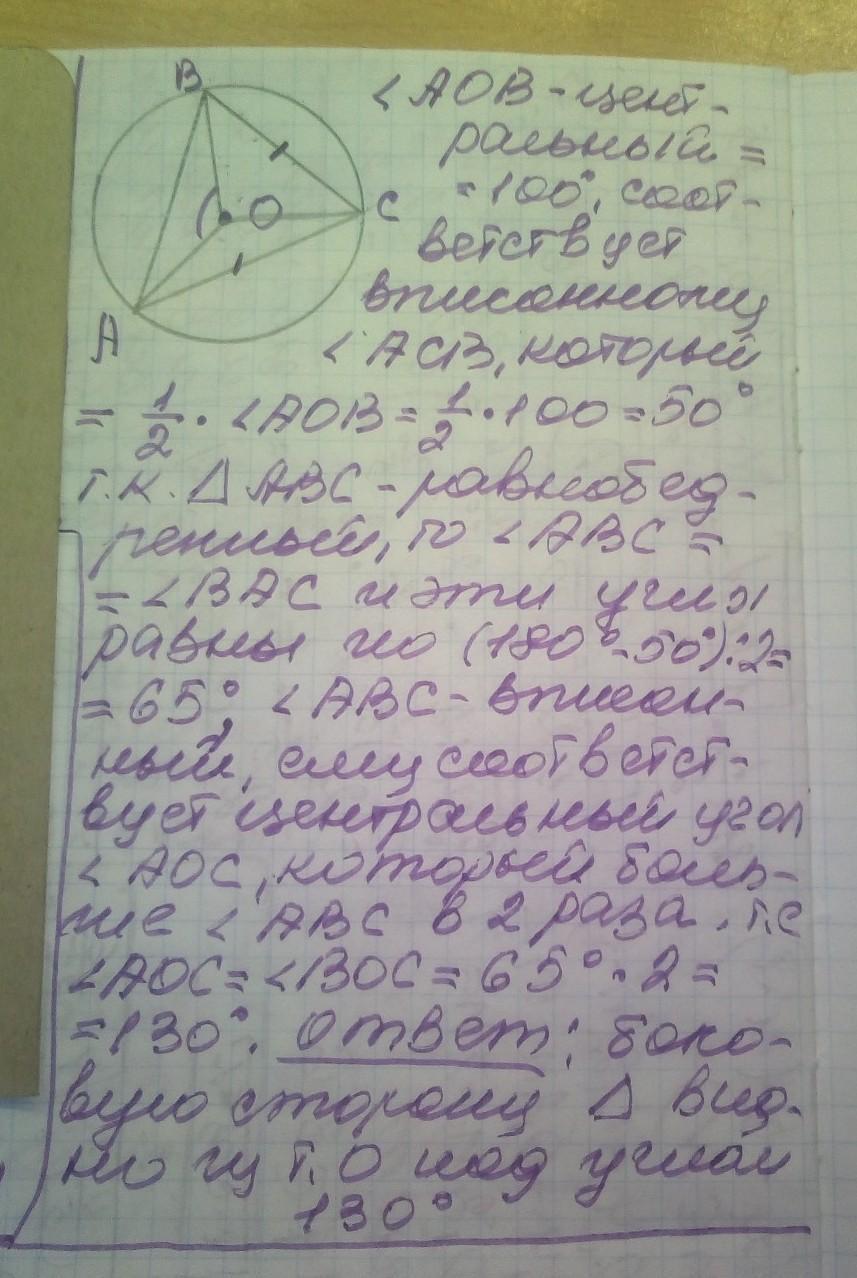Основу рівнобедреного трикутника з центра О описаного навколо нього кола видно під кутом 100 гр. Під яким кутом із точки О видно бічну сторону трикутника?