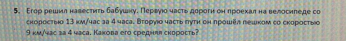5. Егор решил навестить бабушку. Первую часть дороги он проехал на велосипеде со скоростью 13 км/час за 4 часа. Вторую часть пути он прошёл пешком со скоростью 9 км/час за 4 часа. Какова его средняя скорость?