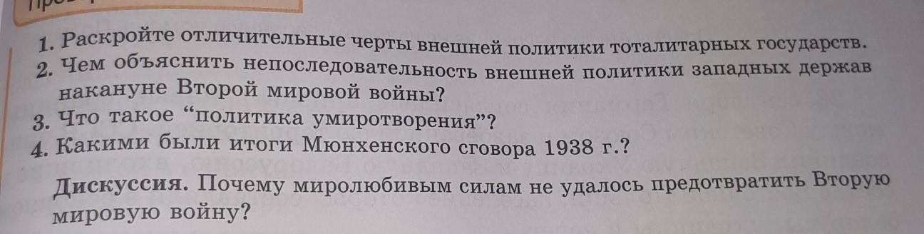 1. Раскройте отличительные черты внешней политики тоталитарных государств. 2. Чем объяснить непоследовательность внешней политики западных держав накануне Второй мировой войны? 3. Что такое “политика умиротворения”? 4. Какими были итоги Мюнхенского сговора 1938 г.? Дискуссия. Почему миролюбивым силам не удалось предотвратить Вторую мировую войну?
