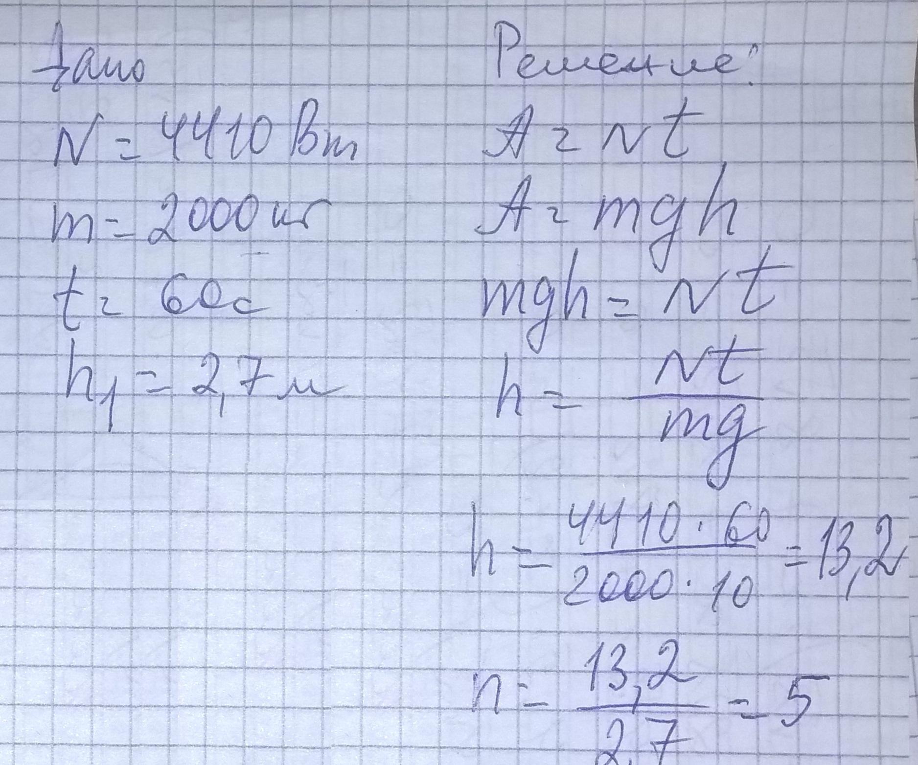 Кран, мощностью 4410 Вт поднимает плиту массой 2т на крышу дома за 1 мин. Сколько этажей в доме? примите высоту этажа за 2.7 м