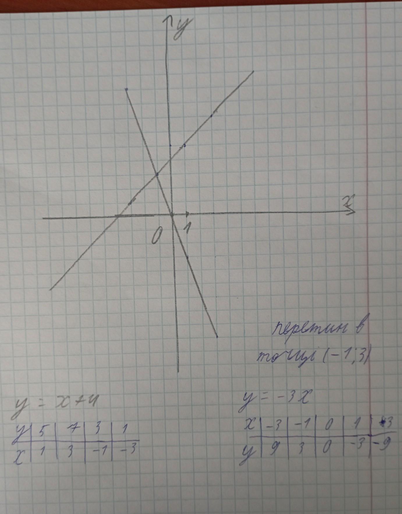 1. В одній системі координат побудуйте графіки функції у = х + 4 і у= - 3x знайдіть координати точки їхнього перетину. Будь ласка