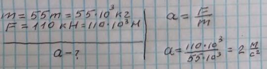 З яким прискоренням рухається під час розгону реактивний літак масою 55 т, якщо сила двигунів 110 кН? (задачу розв’язуємо у робочому зошиті, фотографуємо, фото прикріплюємо для перевірки)