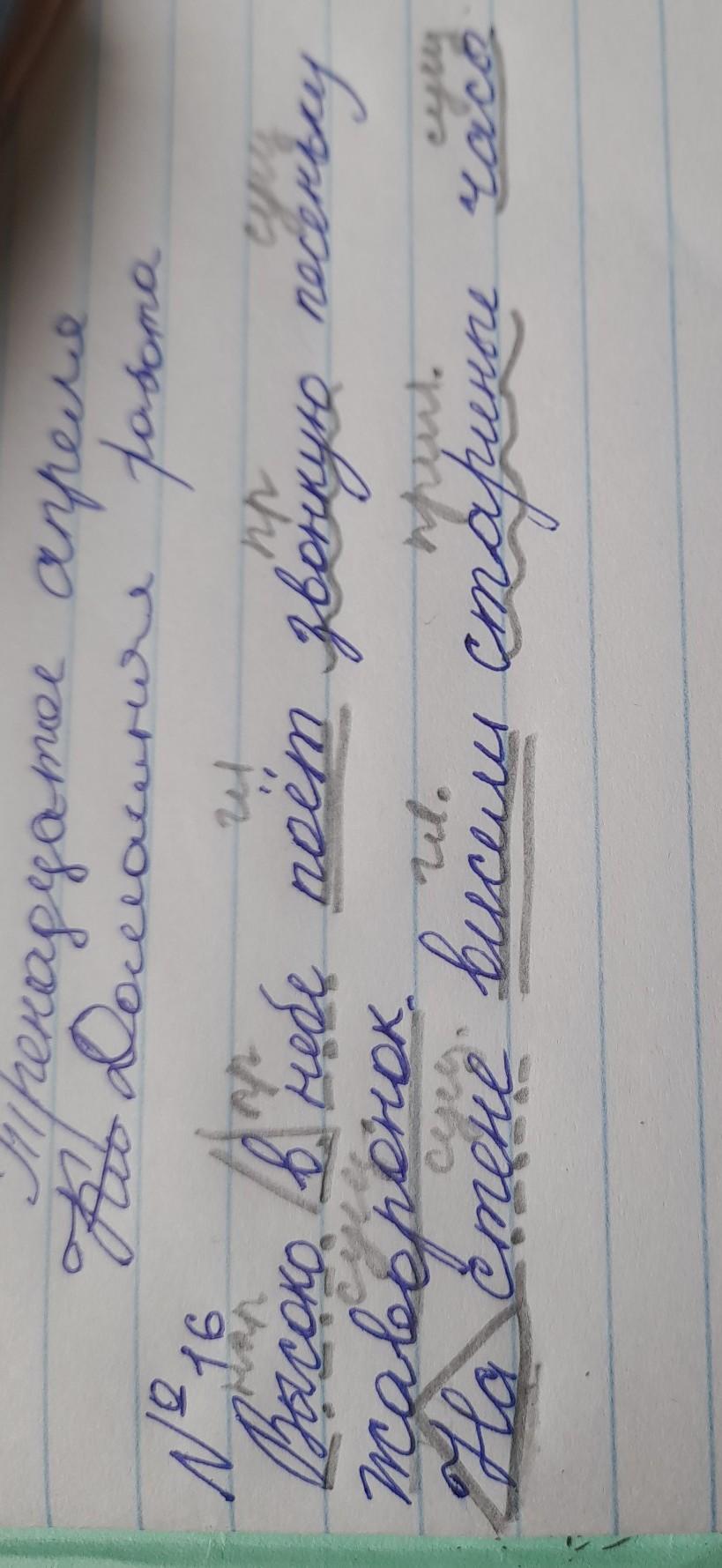 качества Степени? 16. Спиши предложения. Выполни их синтаксический разбор (разбери по членам предложения). Обозначь, какой частью речи выражен каждый член предложения. 1. Высоко в небе поёт звонкую песенку жаворонок. 2. На стене висели старинные часы. 3. Громко звенела весенняя капель. 4. За окном звонко пела маленькая Птичка.