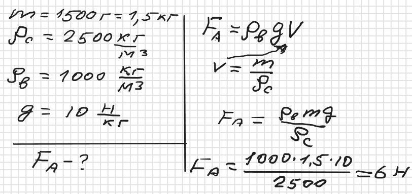 СРОЧНО!!! Яка виштовхувальна сила діє на скляне тіло масою 1500г,яке повністю занурене у воду?(густина скла=2500кг/м³, густина води=1000кг/м³